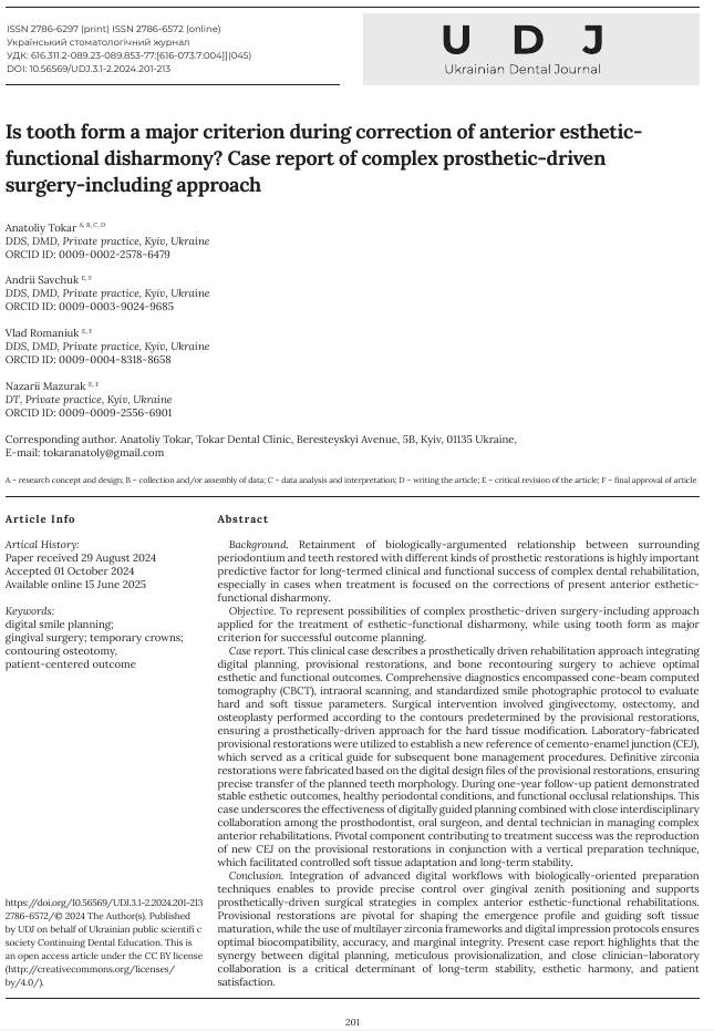 Therefore, dear readers, we are pleased to present to you the fourth issue of the Ukrainian Dental Journal – journal that can serve as the starting point of your own scientific journey, journal open to collaboration not only with researchers but also with practicing clinicians, and dedicated to showcasing Ukrainian dental experience and scientific achievements at the international level, while aspiring to meet only the highest standards.