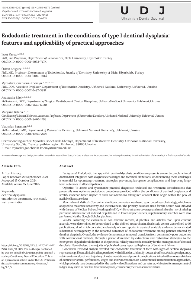 Aims and scope: The aim of Ukrainian Dental Journal is to provide a platform for the sharing of evidence-based investigations and analyzing general medical issues in the multidisciplinary fields of clinical dentistry, preventive dentistry, maxillofacial surgery and oncology, ENT, anesthesiology, of interest to scholars and clinicians in Ukraine and world-wide. The Journal regularly solicits reviews and expert opinion pieces of scholars from all over the world to expand the prospects of scientific collaboration of Ukrainian fellows.